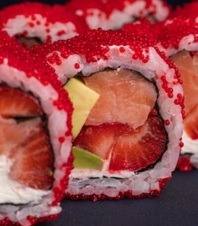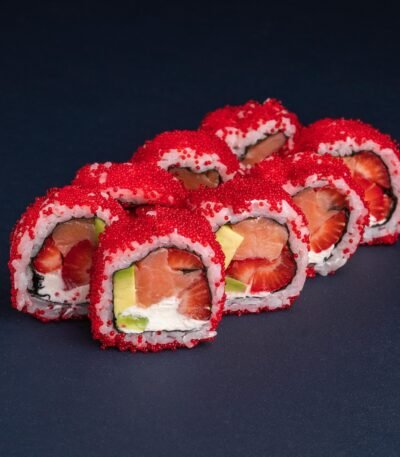 Рис, норі, копчений лосось, полуниця, авокадо, вершковий сир, ікра тобіко
