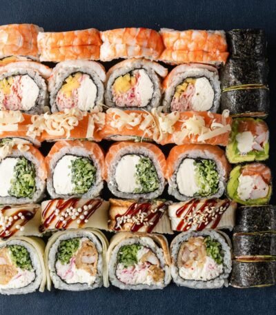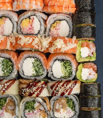 Рис, норі, вершковий сир, зелена цибуля, огірок, копчений лосось та цибулевий кранч