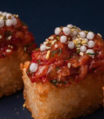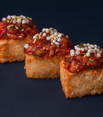 Ароматний рис, обсмажений у фритюрі до легкої хрусткої скоринки, із ніжним лососем та свіжістю зеленої цибулі. Доповнений соусами кімчі та устричним, з хрумкими рисовими кульками та спецією фурікаке