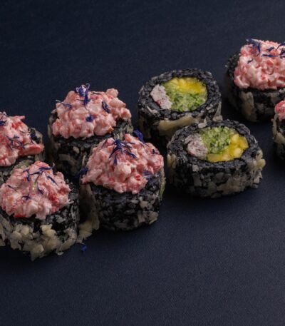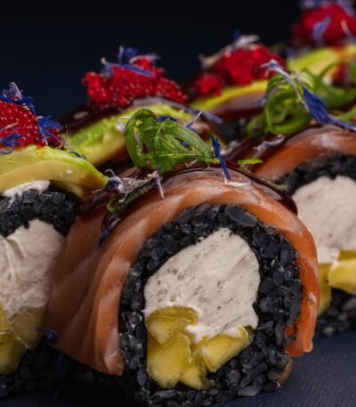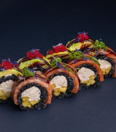 Рис із чорнилом каракатиці, норі, лосось, авокадо, манго, вершковий сир, соус унагі, зелена цибуля, ікра тобіко, сушена волошка