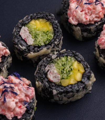 Рис із чорнилом каракатиці, норі, сурімі, манго, огірок, пармезан, вершковий сир, відварна креветка, маринований імбир, волошка