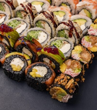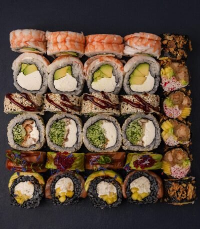 Рис, норі, вершковий сир, зелена цибуля, огірок, копчений лосось, стружка тунця