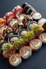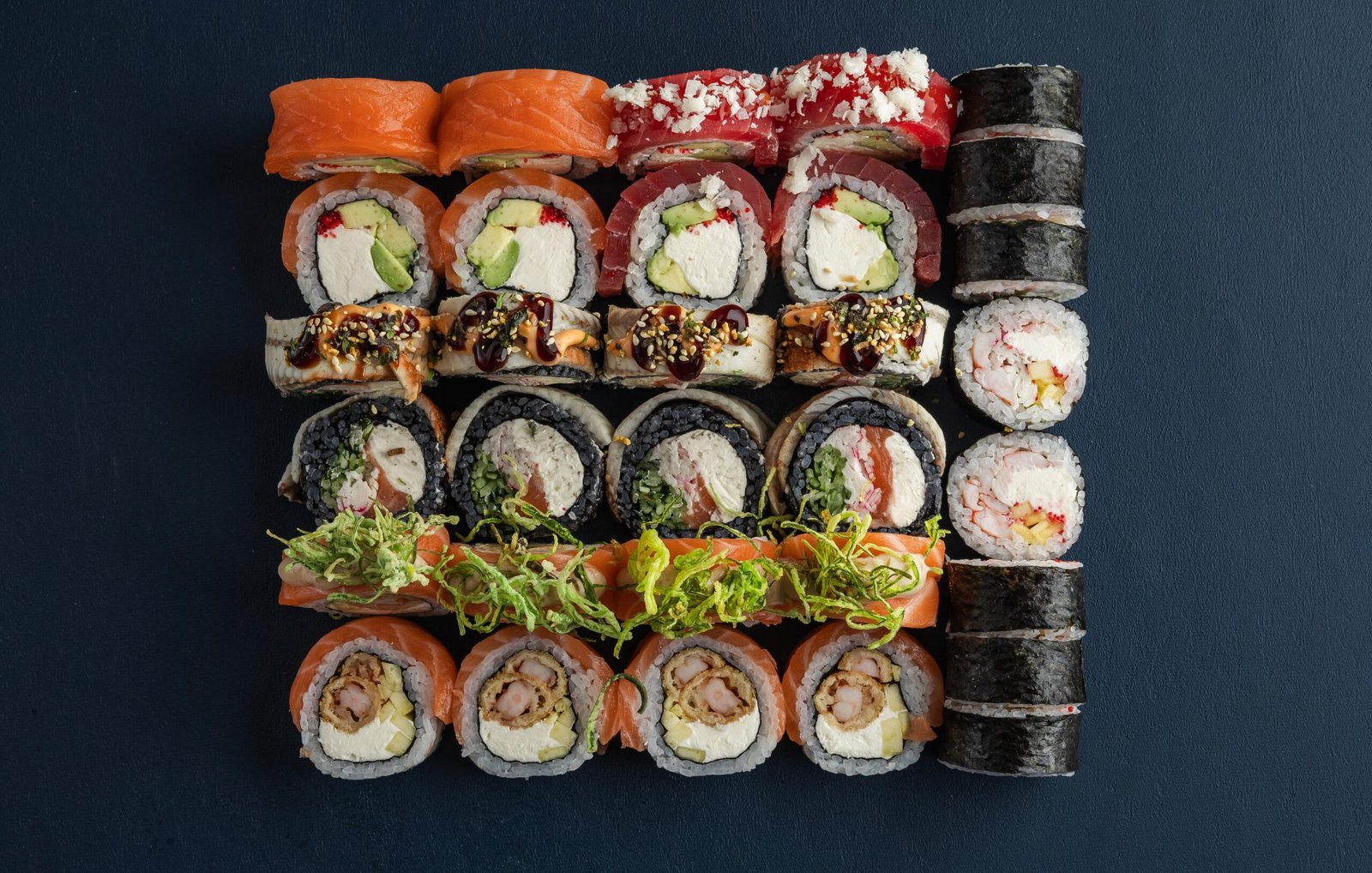 Пів порції Філадельфія з лососем та пів порції Філадельфія з тунцем, Чорний Дракон, авторський рол Горіховий Прибій та Футумаки з креветкою