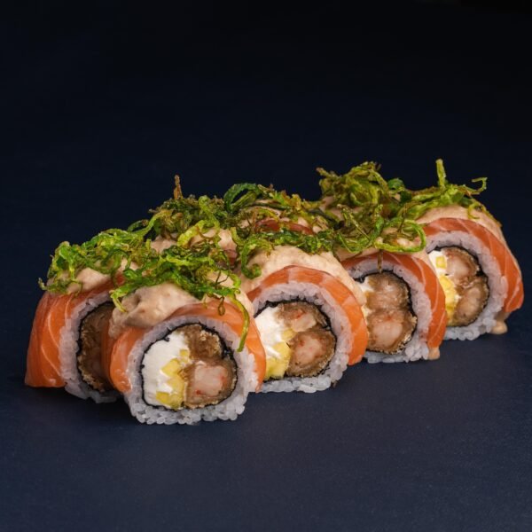 Рис, норі, вершковий сир, креветка в темпурі, манго, лосось, соус горіховий, чука фрі