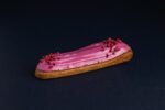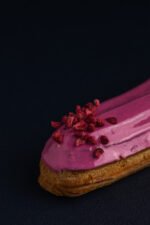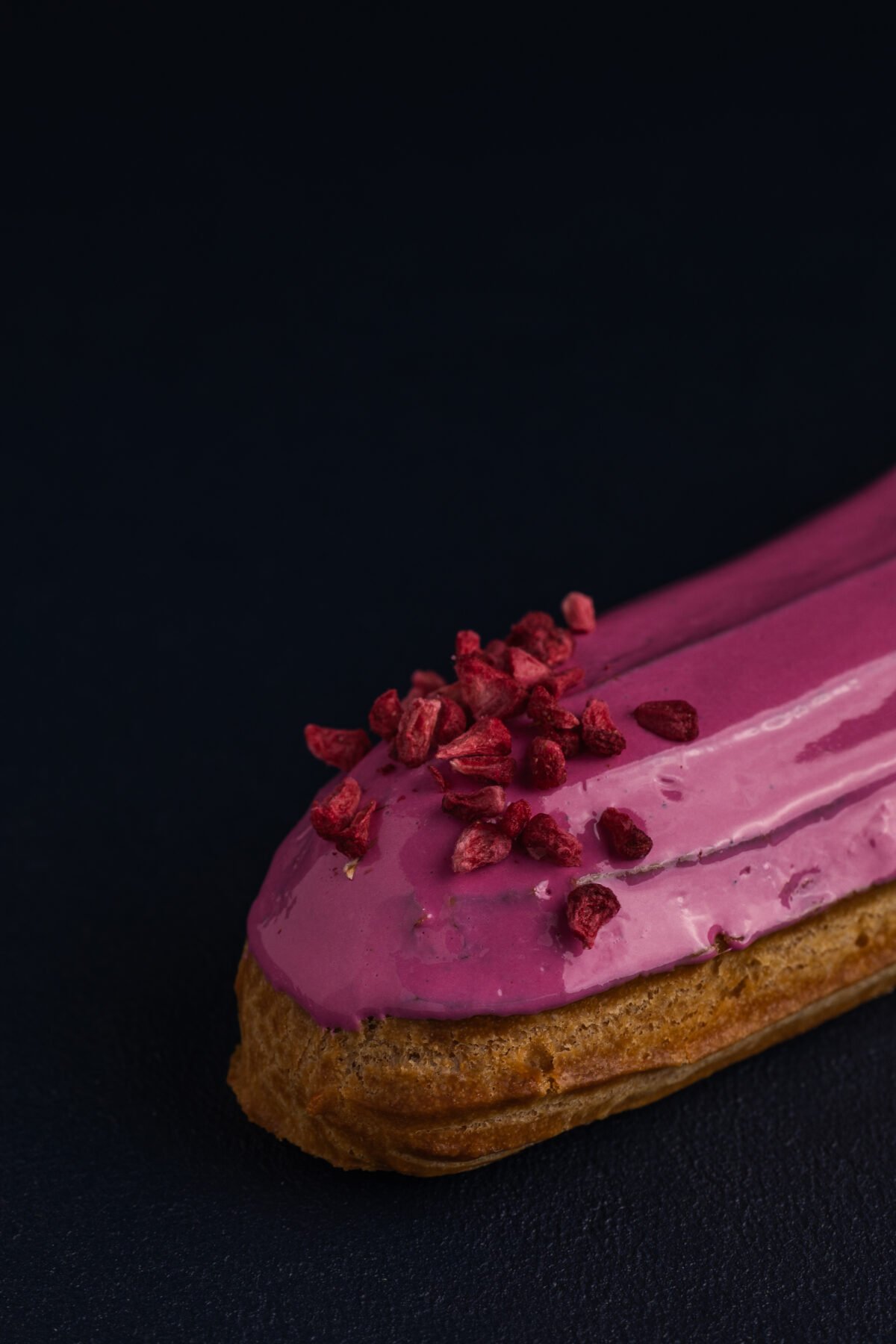Заварне тісто, наповнене ніжним вершковим кремом на основі пудри йогурту, зверху покриваємо глазур’ю та сублімованою полуницею