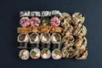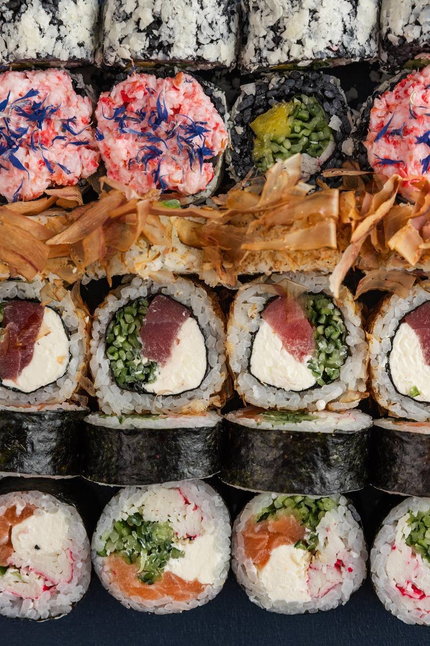 Класичні роли: Боніто з тунцем, Футумаки з лососем та сурімі, Темпура з вугрем та авторський рол Чорне Сонце