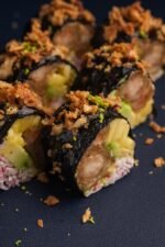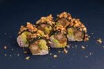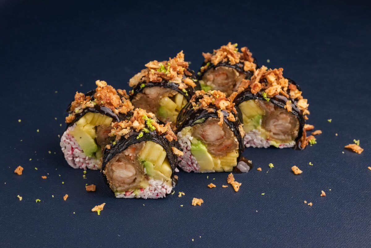 Норі, креветка в темпурі, сурімі, манго, авокадо, ікра тобіко, солодкий чилі, цедра лайма