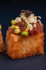 Хрусткий рис рис із ніжним тунцем та свіжим авокадо, доповнений трюфельною пастою та посипаним пармезаном