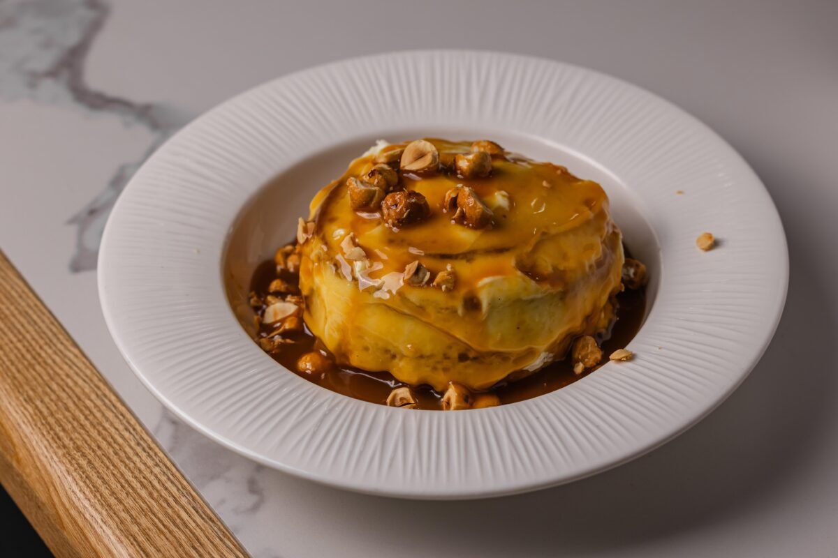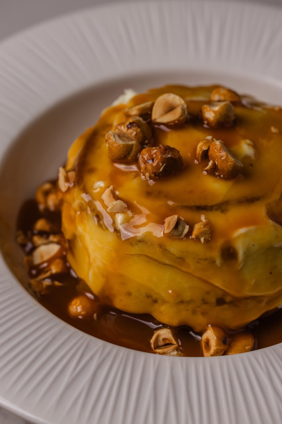 Пухка й ніжна булочка з ароматною начинкою з кориці, тростинного цукру та вершкового масла. Зверху ми покриваємо її ніжним кремом із маскарпоне, поливаємо крафтовою карамеллю та посипаємо хрустким карамелізованим фундуком
