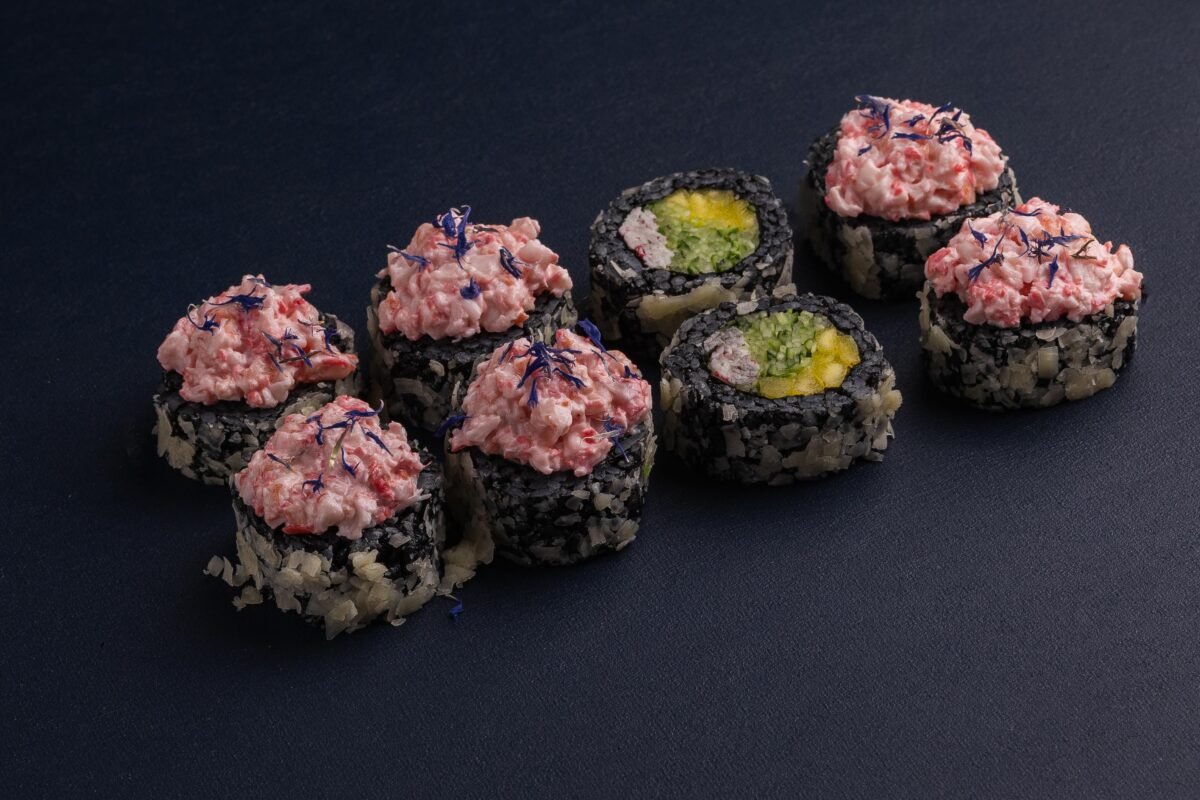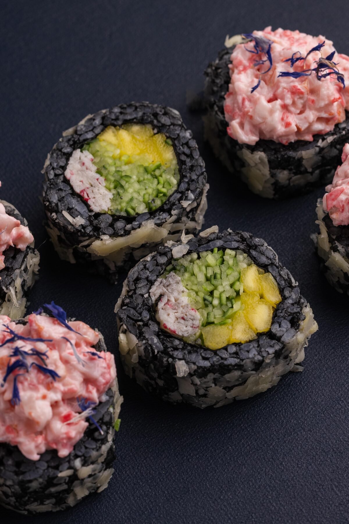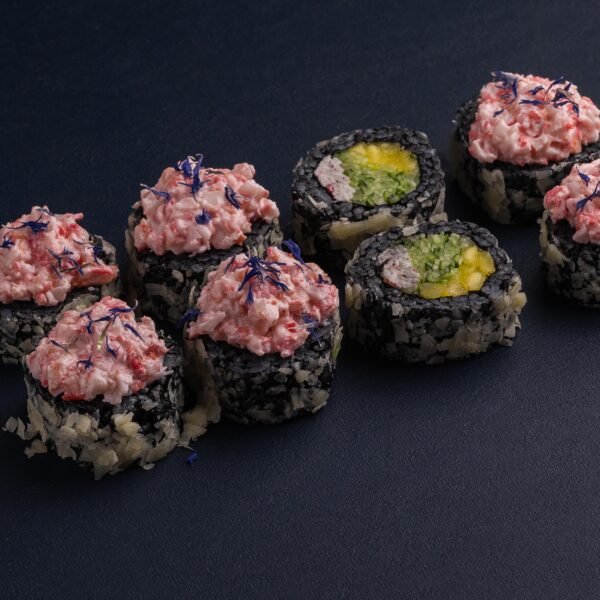 Рис із чорнилом каракатиці, норі, сурімі, манго, огірок, пармезан, вершковий сир, відварна креветка, маринований імбир, волошка