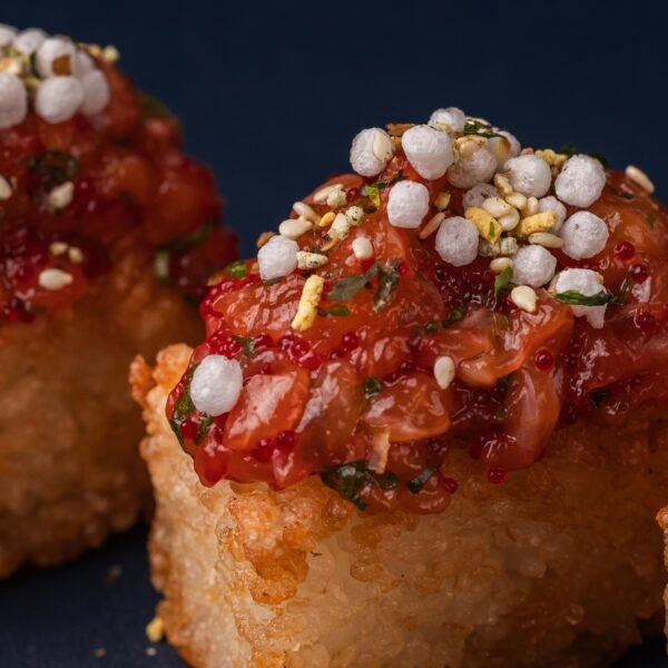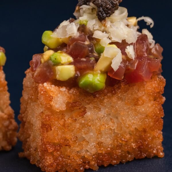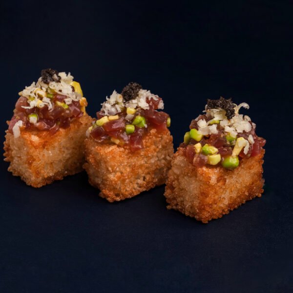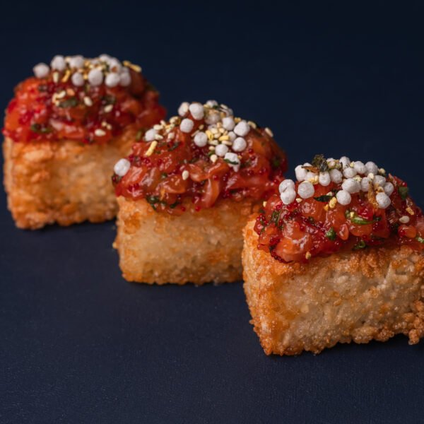 Ароматний рис, обсмажений у фритюрі до легкої хрусткої скоринки, із ніжним лососем та свіжістю зеленої цибулі. Доповнений соусами кімчі та устричним, з хрумкими рисовими кульками та спецією фурікаке