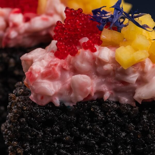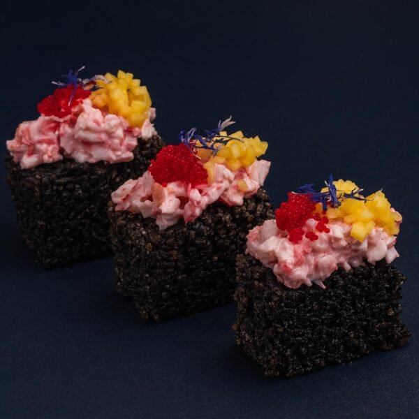 Одночасно ніжний і хрусткий рис із чорнилом каракатиці в поєднанні з відвареною креветкою, вершковим сиром та маринованим імбирем. Зверху прикрашаємо ікрою тобіко, шматочками манго та сушеними волошками