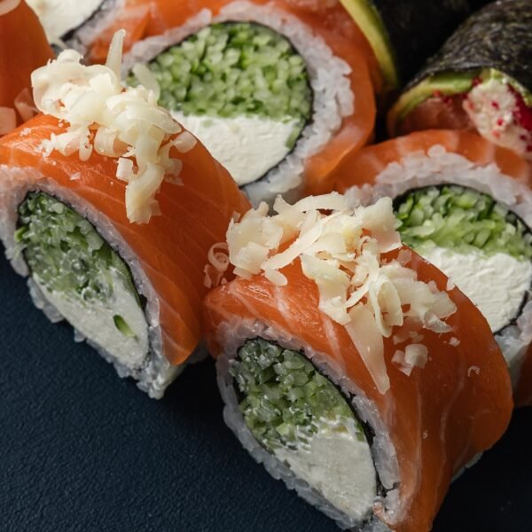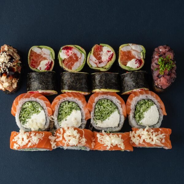 Сет №7 — найбільший наш варіант, до якого входить: Філадельфія з тунцем, Філадельфія з копченим лососем, фірмовий рол гачок, Гейша, Каліфорнія з креветкою, рол Поцілунок самурая, гункан з червоною ікрою, з вугрем та з лососем, нігірі — з тунцем, з лососем та з креветкою. Доповнили темпурою з вугрем та темпурою з лососем та авокадо